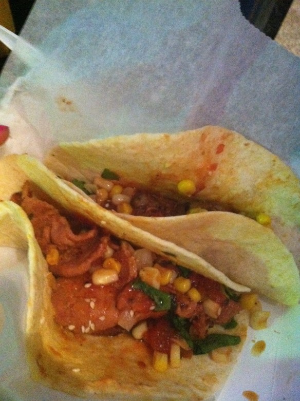 These tacos come in pairs and you can choose from pork, chicken or both! I opted to try one of each, and was sadly disappointed. The chicken wasn’t bad, it had a nice heat to it, and the crunch of the sweet corn and other veggies inside was a nice change from the fried foods I’d had earlier, but the pork was horribly salty. I had one bite before I passed off the rest to my fellow tasters, with the majority favoring the more flavorful chicken over the more spicy pork. I’d skip this one unless you’re really looking for some salt and spice.
