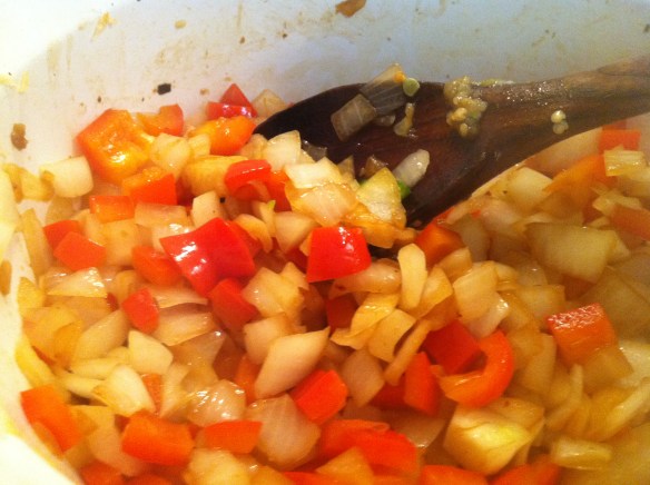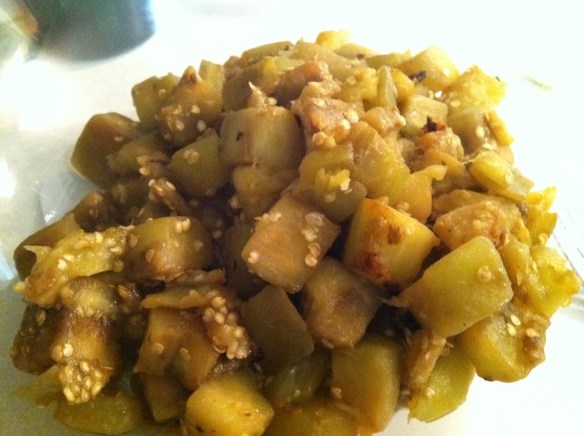 1. In a large casserole dish or Dutch oven (and I mean large, this nearly didn’t fit in the pan I used and I made a huge mess all over the stove top) heat 1/4 cup of the olive oil. Add the eggplant and cook over moderately high heat, stirring occasionally, until almost tender, about 5 minutes. Add 1/3 of the garlic and cook for another minute. Remove the eggplant from the dish and pour it into a bowl. *Note* this recipe is done in batches to speed up the cooking (and therefore eating). I promise eggplant tastes better than it looks.
