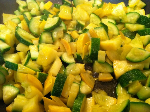 2. While you’re cooking the eggplant: add 2 tablespoons olive oil to a second pan and let it heat up. Then add the zucchini and yellow squash and cook over medium heat until lightly browned in spots, or about 5 minutes. Add another 1/3 of garlic and cook for another minute. Remove the zucchini/squash mixture and add it to the bowl with the eggplant.