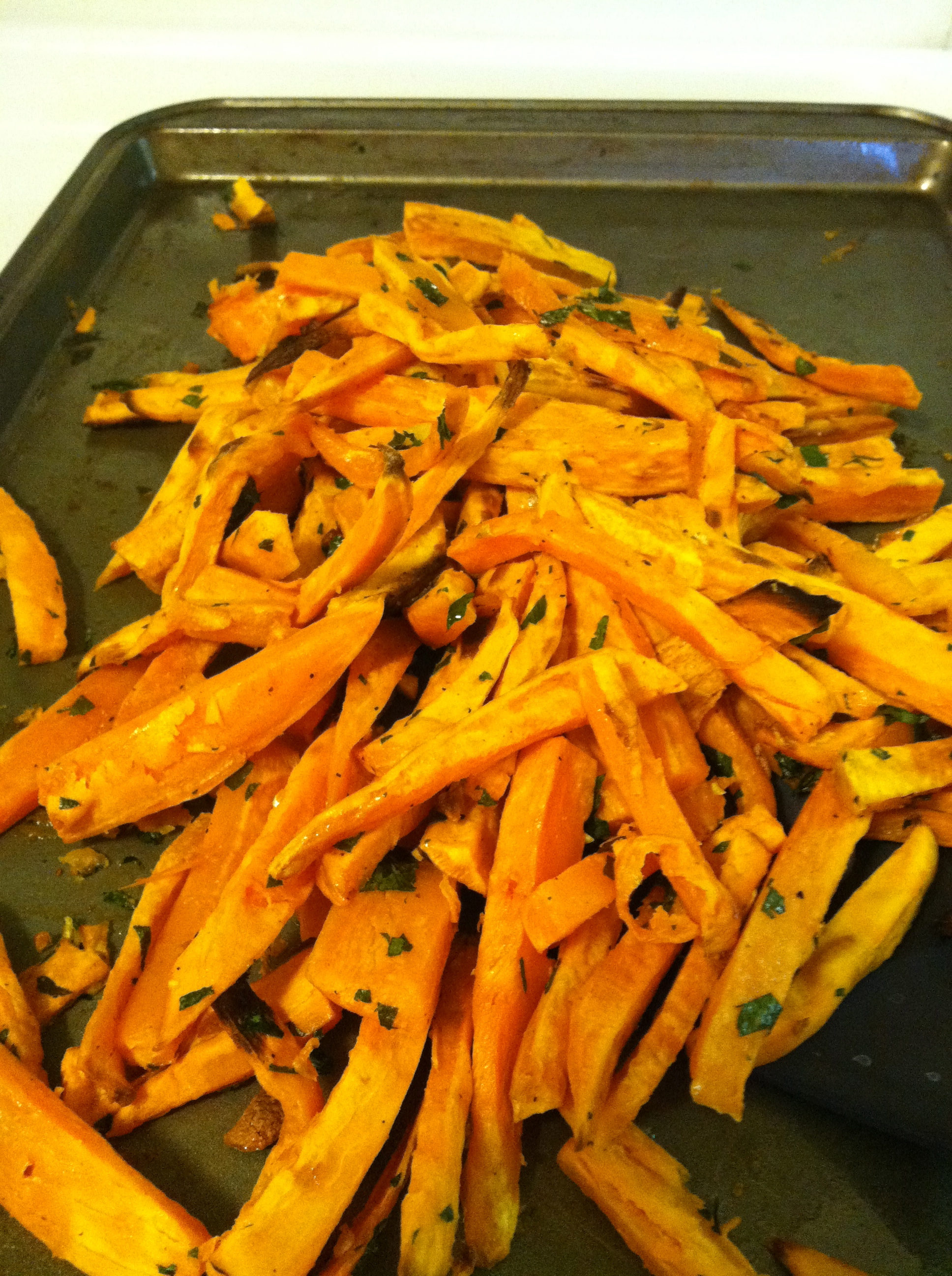 What is surprising is that I have never attempted to make them on my own. The only fries I’ve ever had at home came from a bag, so I was a little intimidated when I decided to take these on. But once those puppies were fresh out of the oven, I just sat there and munched away, straight from the pan! For anyone toying with the idea of making fries at home, go for it! They’re easy, amazingly delicious and much lower in fat since mine are baked and not fried. Even my sweet potato hating boyfriend (How I ask you, HOW do you hate sweet potatoes?) went back for seconds.
