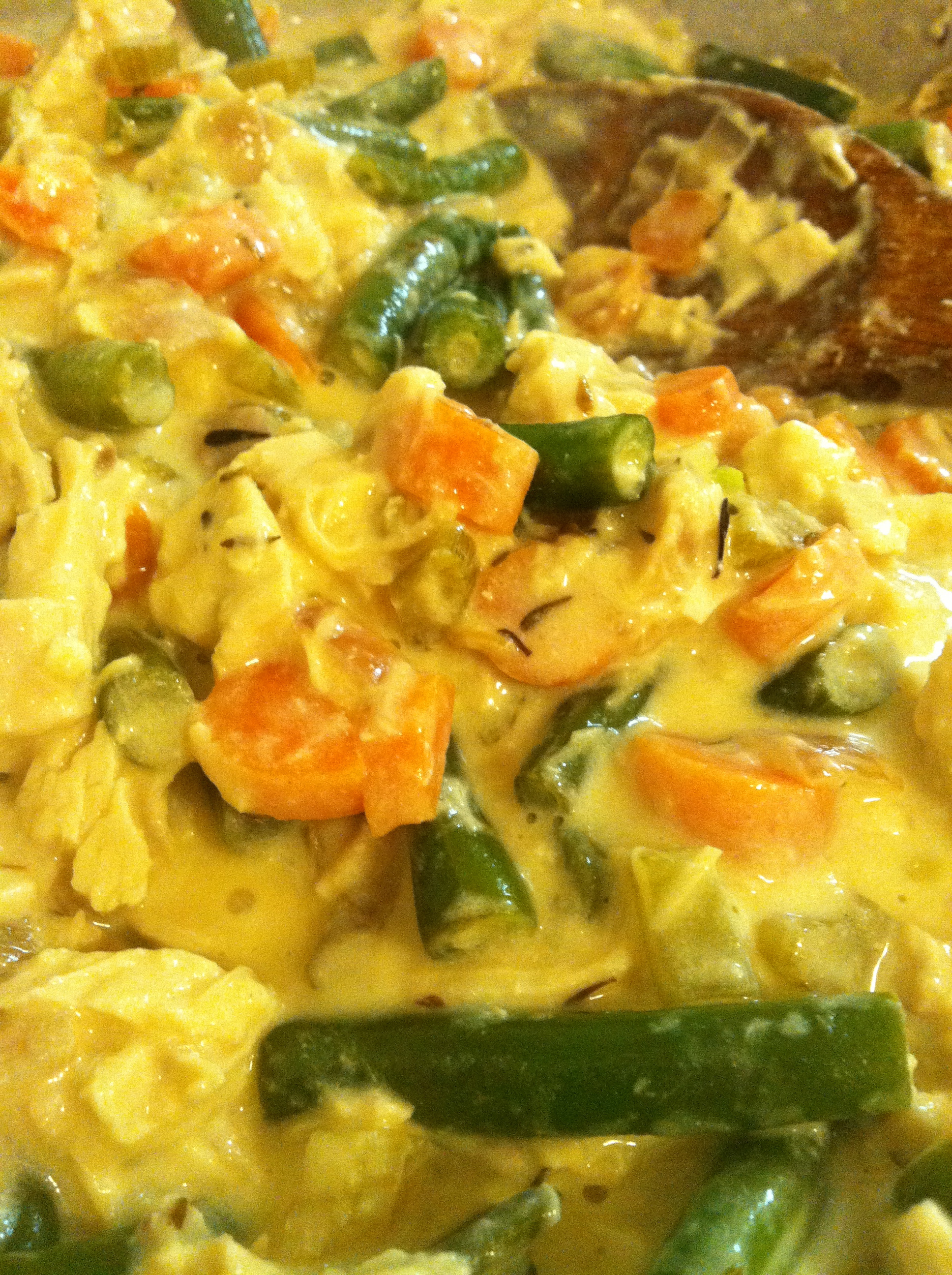 4. Add the green beans and the chicken with the salt and pepper and mix to combine. Reduce to a simmer and add the water, half-and-half and flour to the mixture, stirring constantly to avoid burning on the bottom. Continue cooking until the mixture begins to thicken, about 2 minutes.