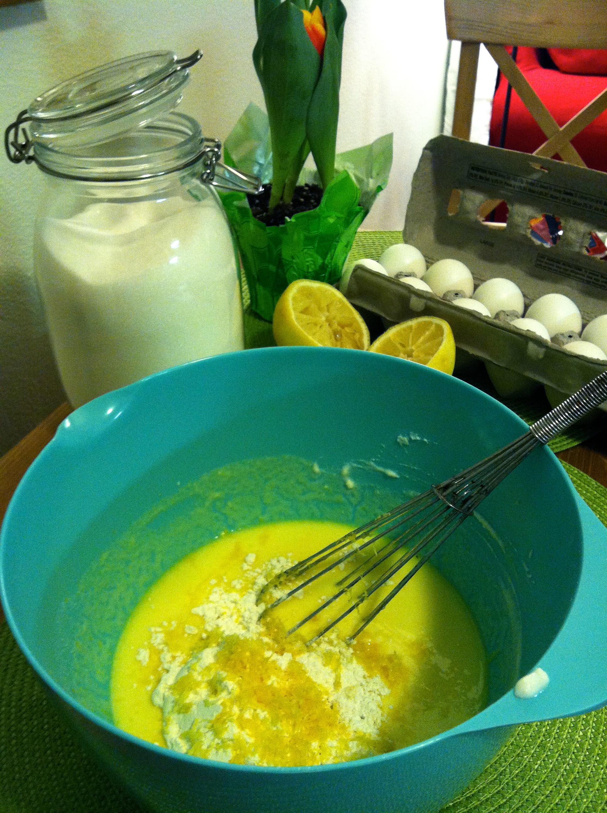 2. Add the flour, lemon zest and lemon juice to the bowl and gently whisk in. Make sure the batter is throughly blended, but try to avoid over mixing as much as you can.