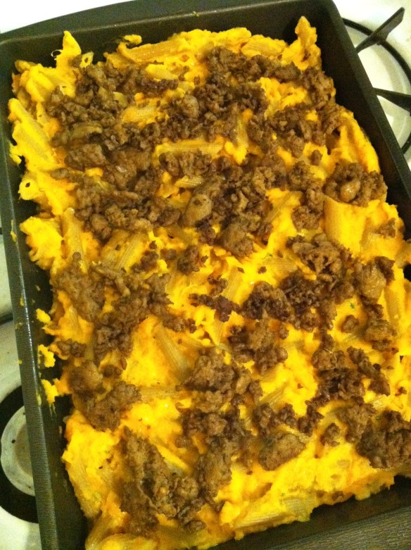 This is a recipe adapted from Cooking Light, they called it sweet potato mac n’ cheese, but based on the sweet-potato-to-cheese ratio, and maybe the fact that I’m Minnesotan, I really thought this qualified as more of a hot dish*.