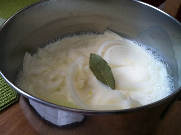 1. Heat 1 3/4 cups milk, onion and the bay leaf in a large sauce pan until just simmering. Cover, remove from heat, and let it stand for 15 minutes. Note: make sure you use a very large pan, you’ll be combining everything in it at the end.