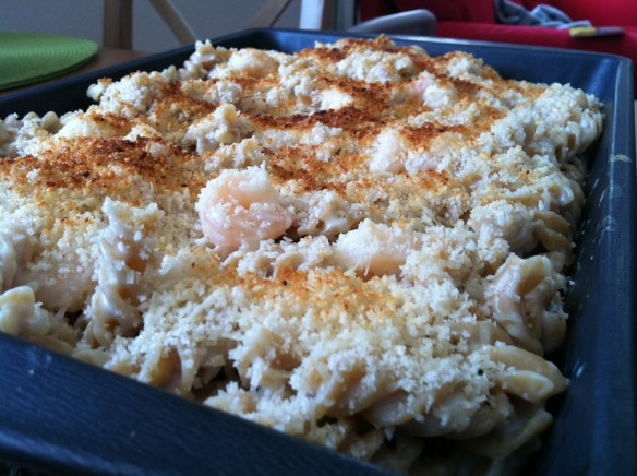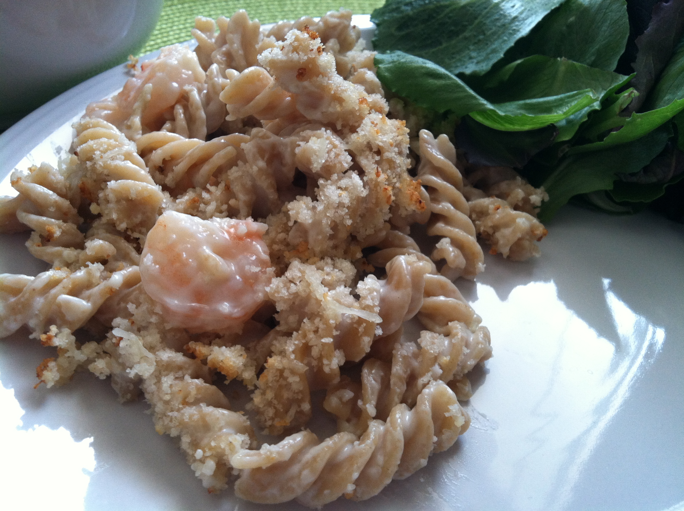 7. Place the panko, parmesan cheese and garlic in a food processor and pulse until you get fine crumbs. Sprinkle the bread crumb mixture over the pasta and broil until golden brown.
