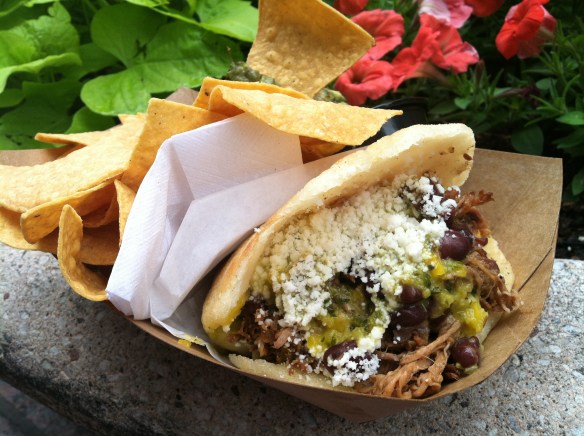 My first stop of the season was Hola Arepa. What’s an Arepa? It’s a delicious cornmeal patty cooked on a griddle. Like a crispy cornmeal pancake. Yummy right? Now, stuff piles of meat, black beans, veggies and whatever else you want in between two of them and you’ll start to understand what Hola Arepa is all about.