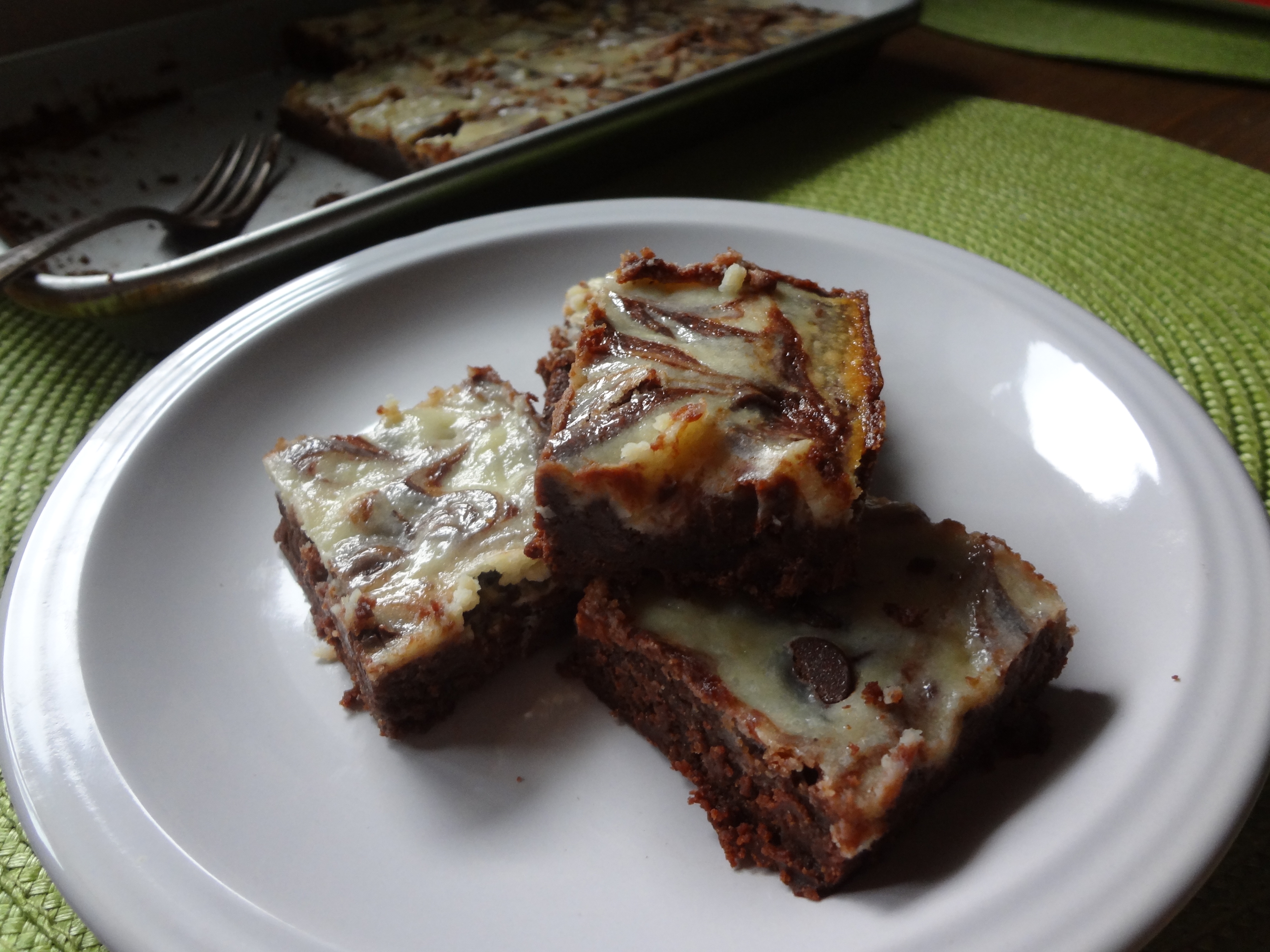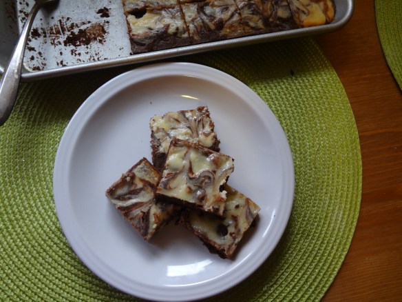 Baker’s note: I drag the knife through vertically in rows through the entire pan, then switch to horizontal dragging to complete the marbling. In some places I had to fold in the cheesecake layer a bit to more evenly distribute it.