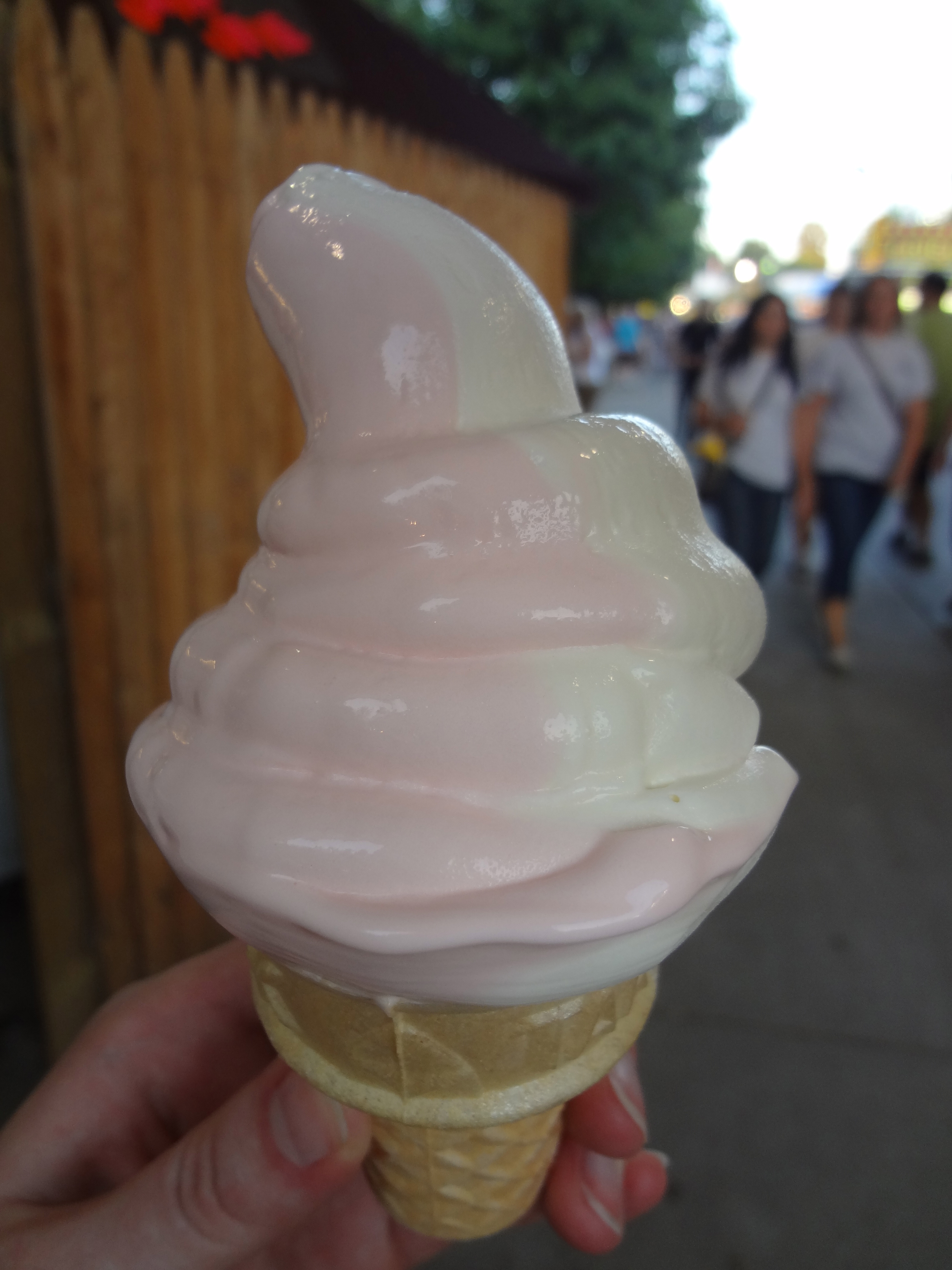 Pictured here is my new favorite flavor combo – vanilla and strawberry twist. This is the smallest sized cone, and at only $3 is a great bargain for the quantity and quality of custard you get. It has an amazing thick and creamy texture without being too rich to finish.