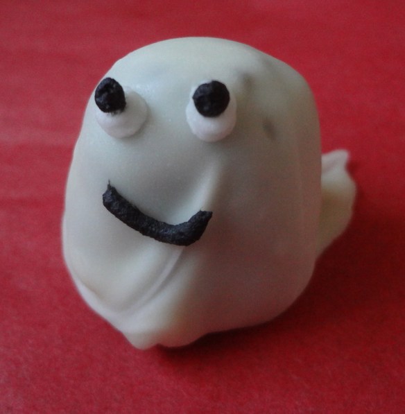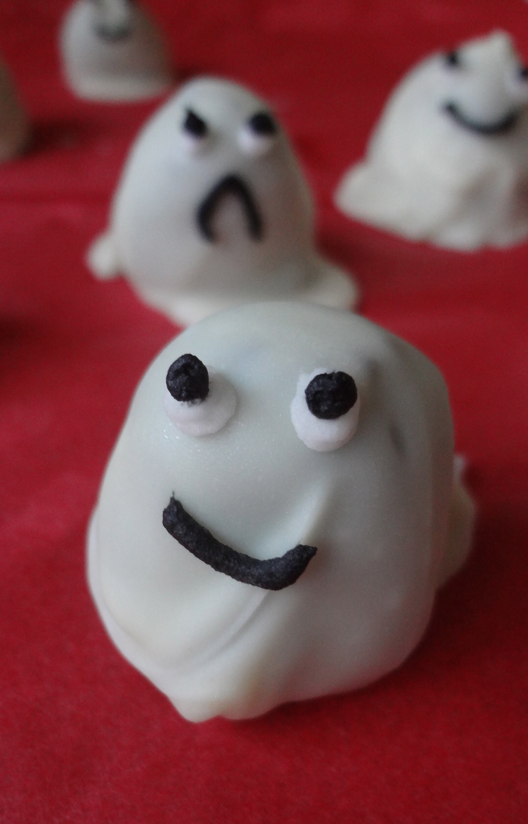5. After the ghosts solidify (about 10 minutes) use the black and white piping frosting to pipe on faces.