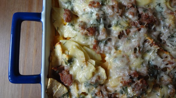 With the abundance of fresh fall produce, and the dark and chilly nights, what’s sounds better than a pan of cheesy, meaty, veggies and fruit? This is comfort food at it’s best. Filling, but not heavy, and loaded with vitamins to beat the winter blues.Depending on the sausage, this would be a great gluten-free alternative to traditional stuffing at a holiday meal – cooked outside the bird of course!