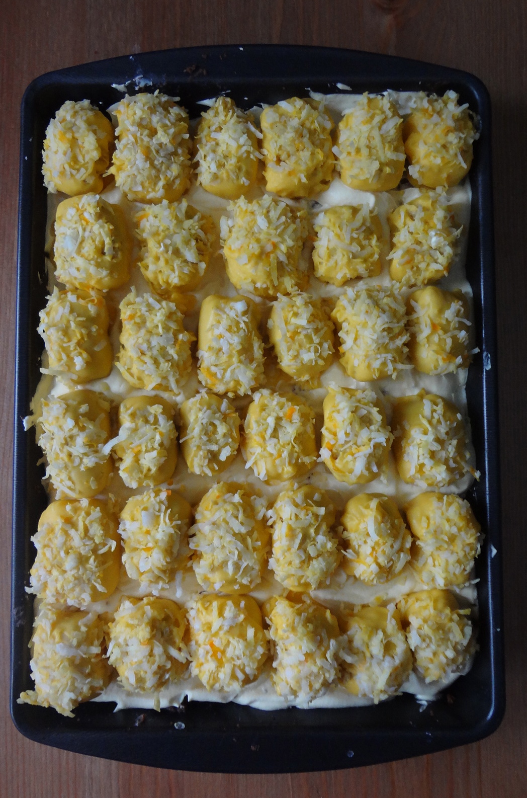 8. Grab your cake tots from the freezer, and dip each one in the candy melts using a fork. Set them on a sheet of wax paper to dry, and sprinkle the tops with the yellow shredded coconut, gently pressing the coconut into the top so it sticks.