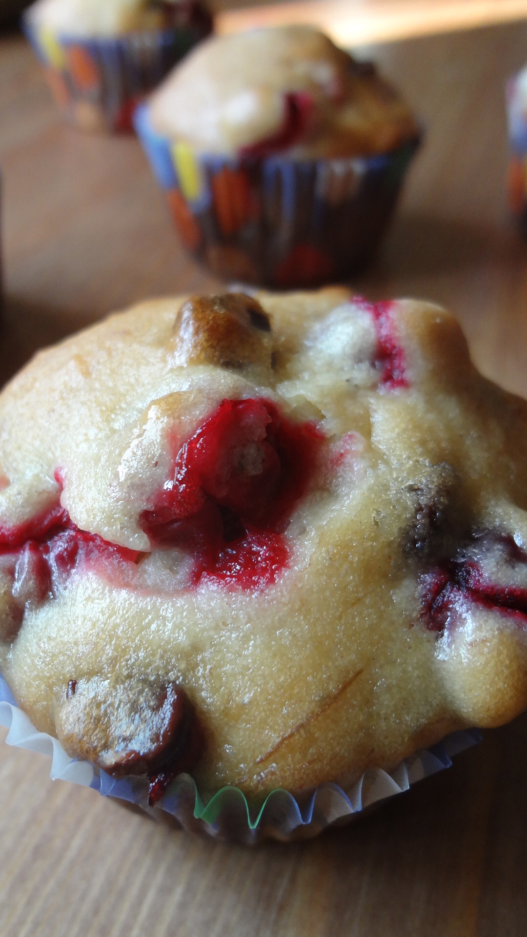 I’ve done chocolate chips in my banana muffins before. Chocolate and bananas go way back, right? But adding the cranberries was something new. I had a bunch left over from a spur of impulse buys at my local farmer’s market back in October, and I thought, why not?