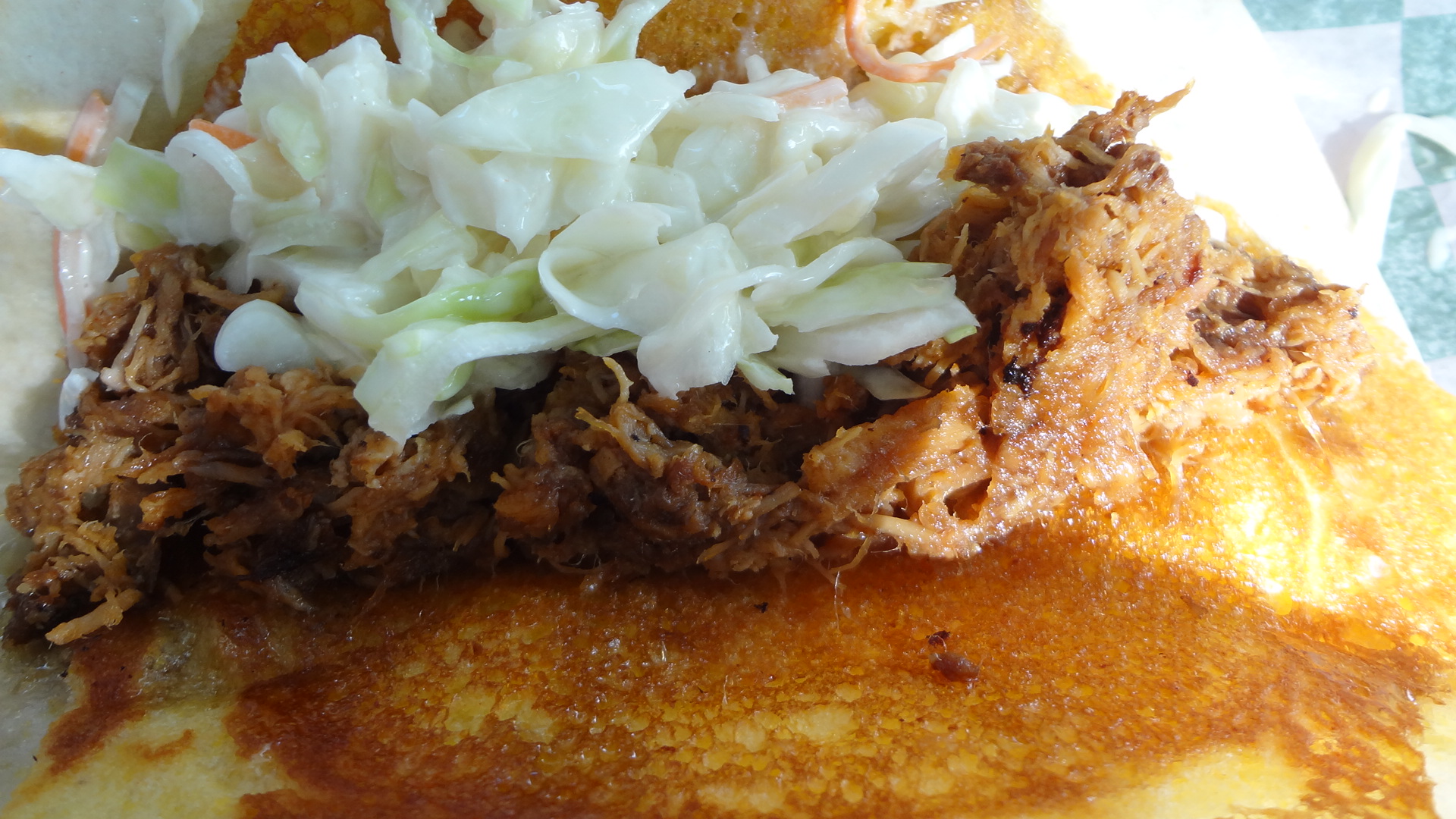 But not so much in practice. The slaw was good, the meat was just ok and probably needed a little more sauce, but the pancake/tortilla combo is where they lost me.