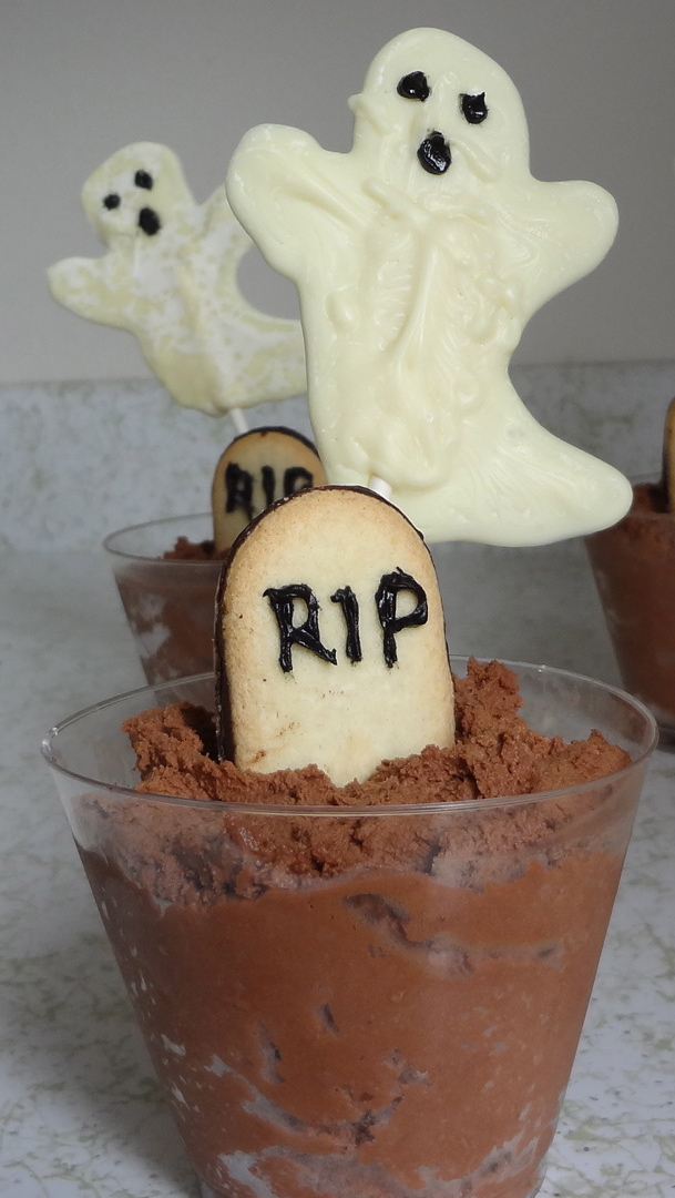 Not adult like booze…adult like chocolate mousse instead of chocolate pudding, and white chocolate ghosts and Milano cookies instead of gummy worms.
