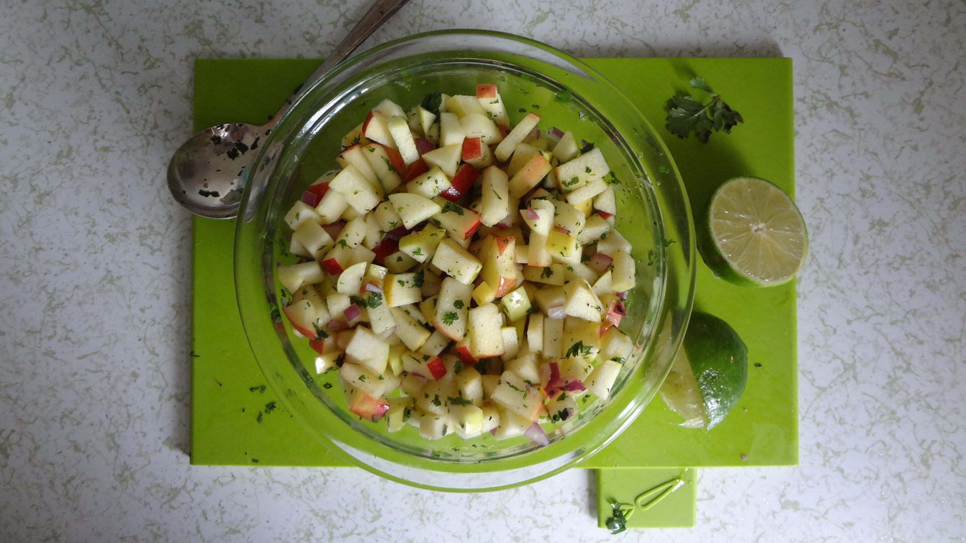 1. Toss together the apple and onion. In a small bowl, whisk the honey, lime juice, and cilantro together.