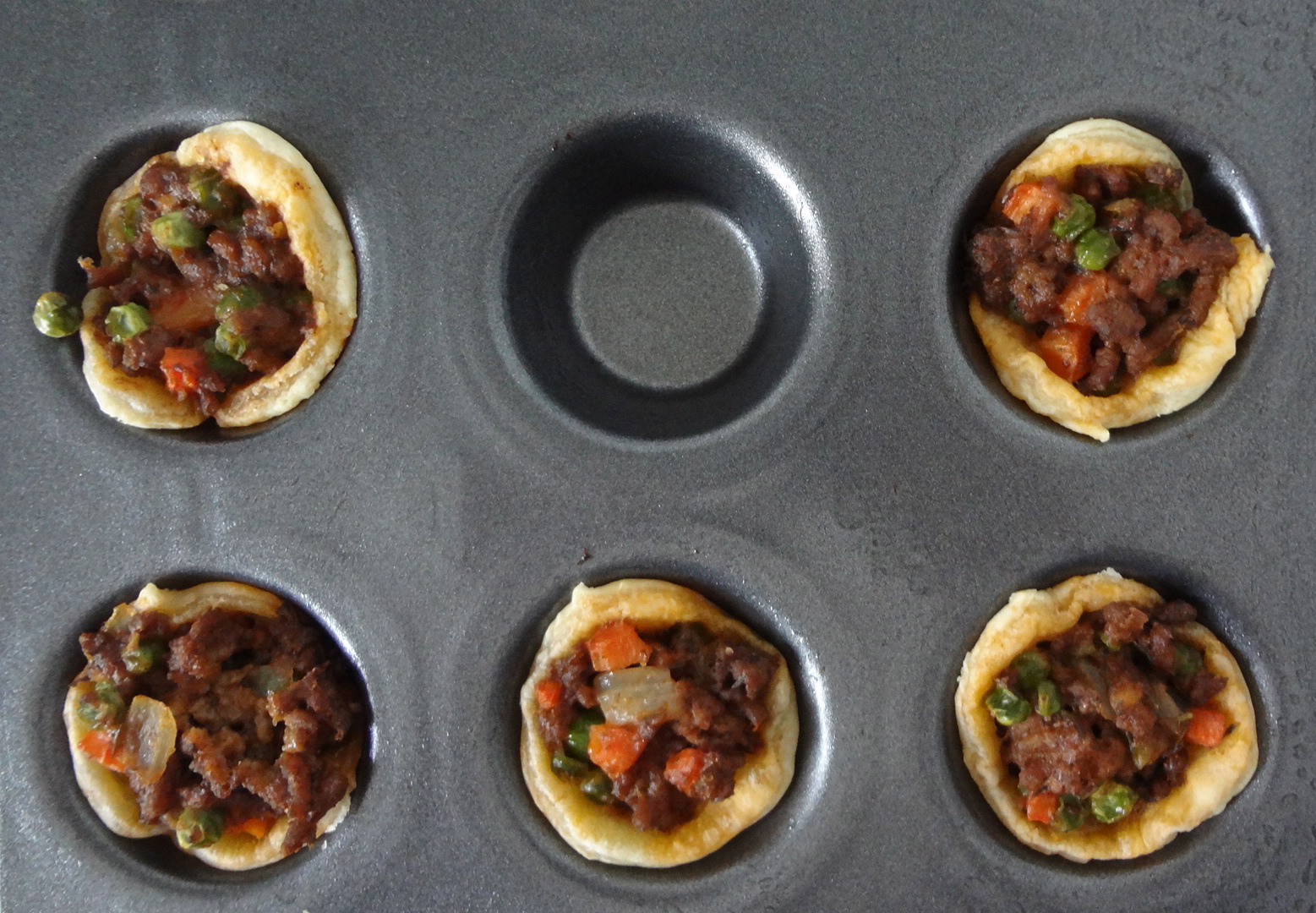 3. Meanwhile, grease a mini muffin pan. Roll out your puff pastry sheet, and using a 2-inch round cookie cutter, cut out circles in the pastry dough, and press them into your mini muffin tins. Fill each tin with a small scoop of beef and bake until the puff pastry is golden brown, about 15 minutes.