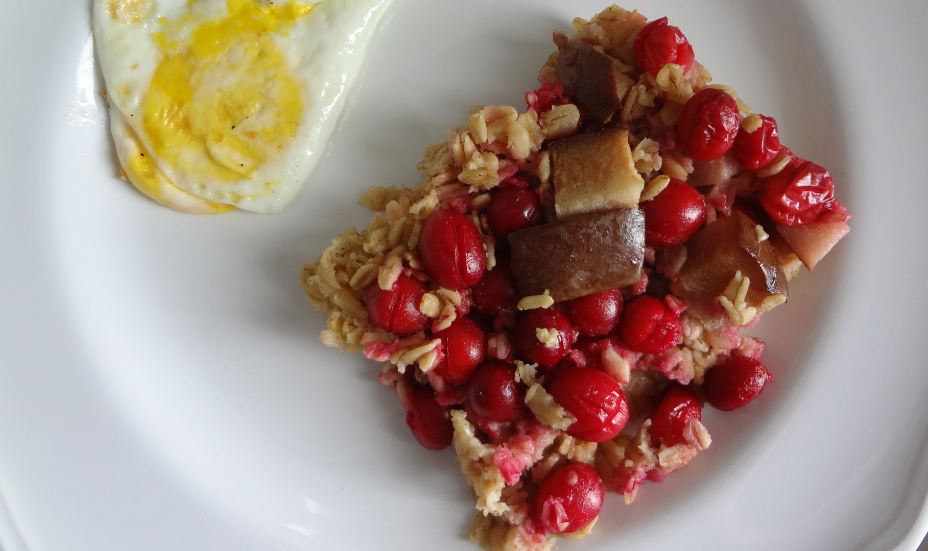 3. In a separate bowl, combine the egg, milk, coconut oil and vanilla extract, mixing well. Add the wet ingredients to the dry ingredients, then pour the whole thing in the baking dish. Fold in your cranberries and pears and bake for 25 to 30 minutes, or until the oats are just set.