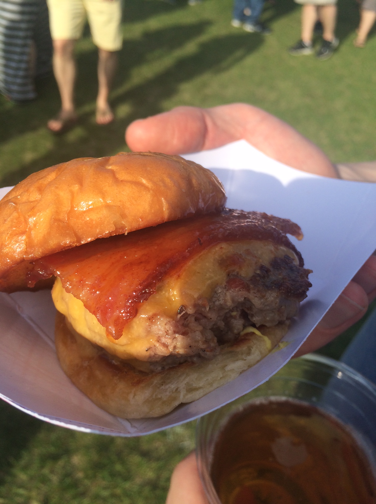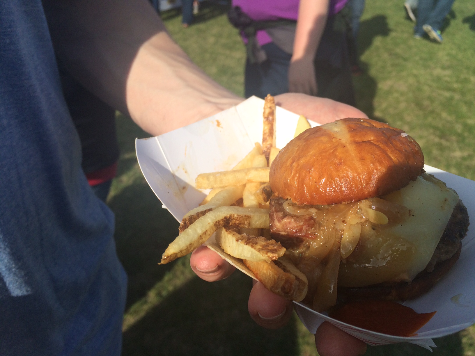 Red Cow was another place I was pulling for. After a mediocre showing last year, I was hoping one of my favorite burger places would come out strong this year. But it was a big, hot mess. Actually, I can’t even say that because it was completely raw inside. A big moderately heated mess. Mushy pink goo covered in cheese and bacon. I supposed that’s a risk you take when you’re sampling from places that are cranking out thousands of burgers, but come on. If you’re going to show up to a burger battle, at least make sure you know how to cook a burger. My poor tasting companion was the first one to take a bite out of here, and I’d show you the after picture, but a big mushy lump of quickly spit out beef doesn’t look very appetizing.