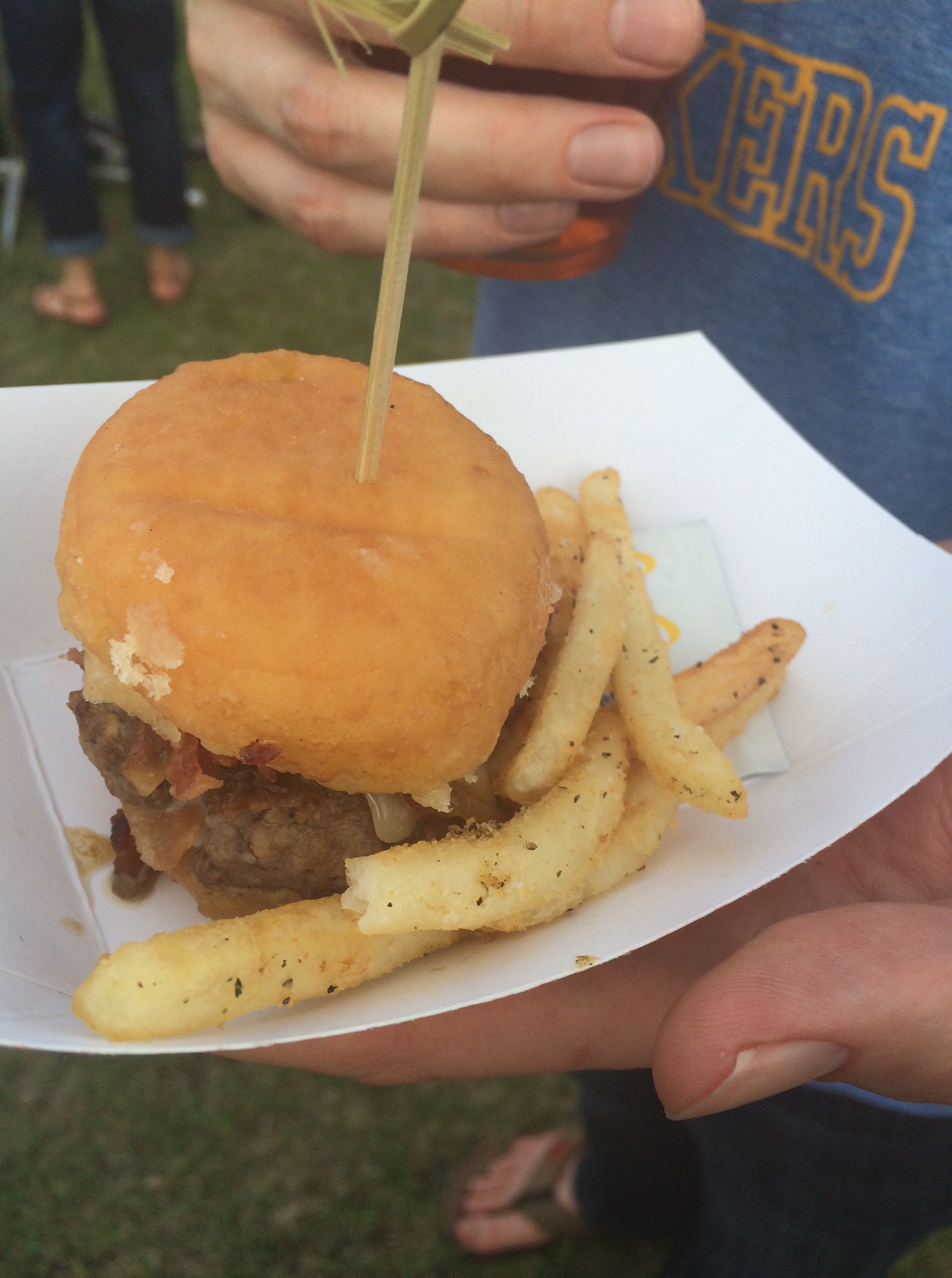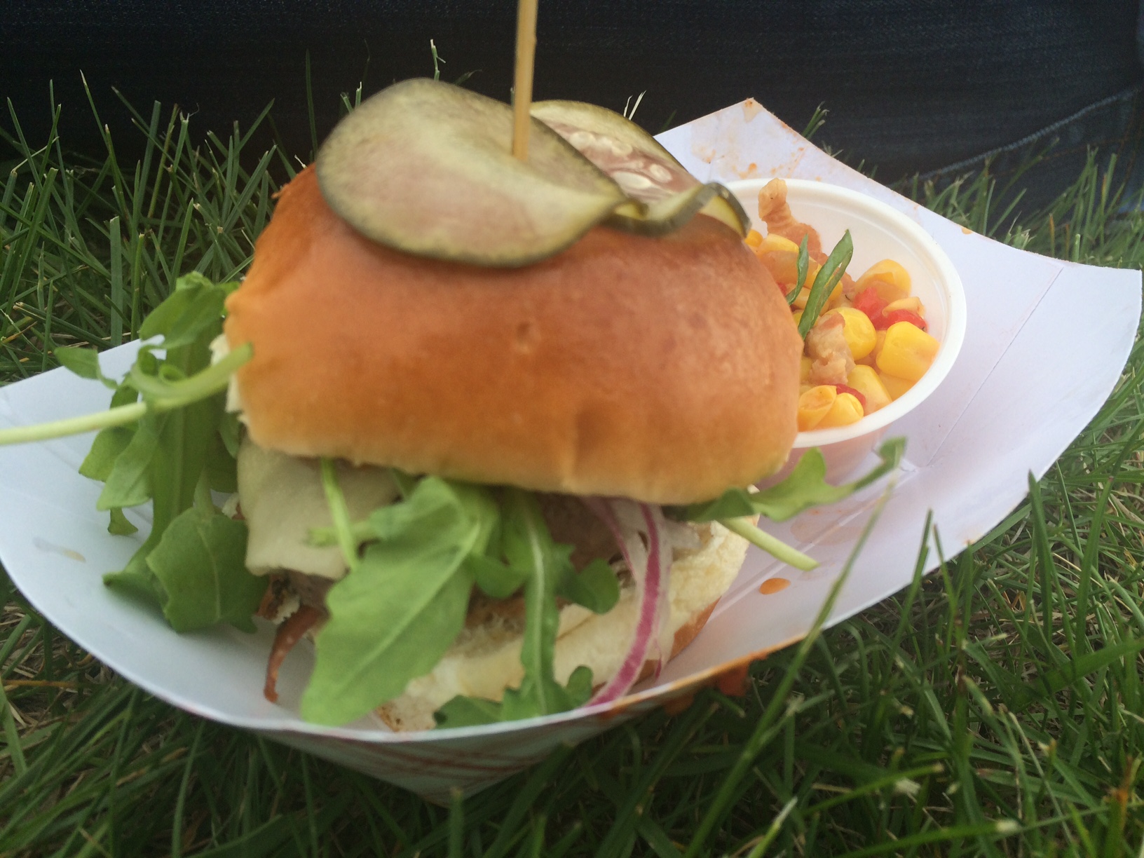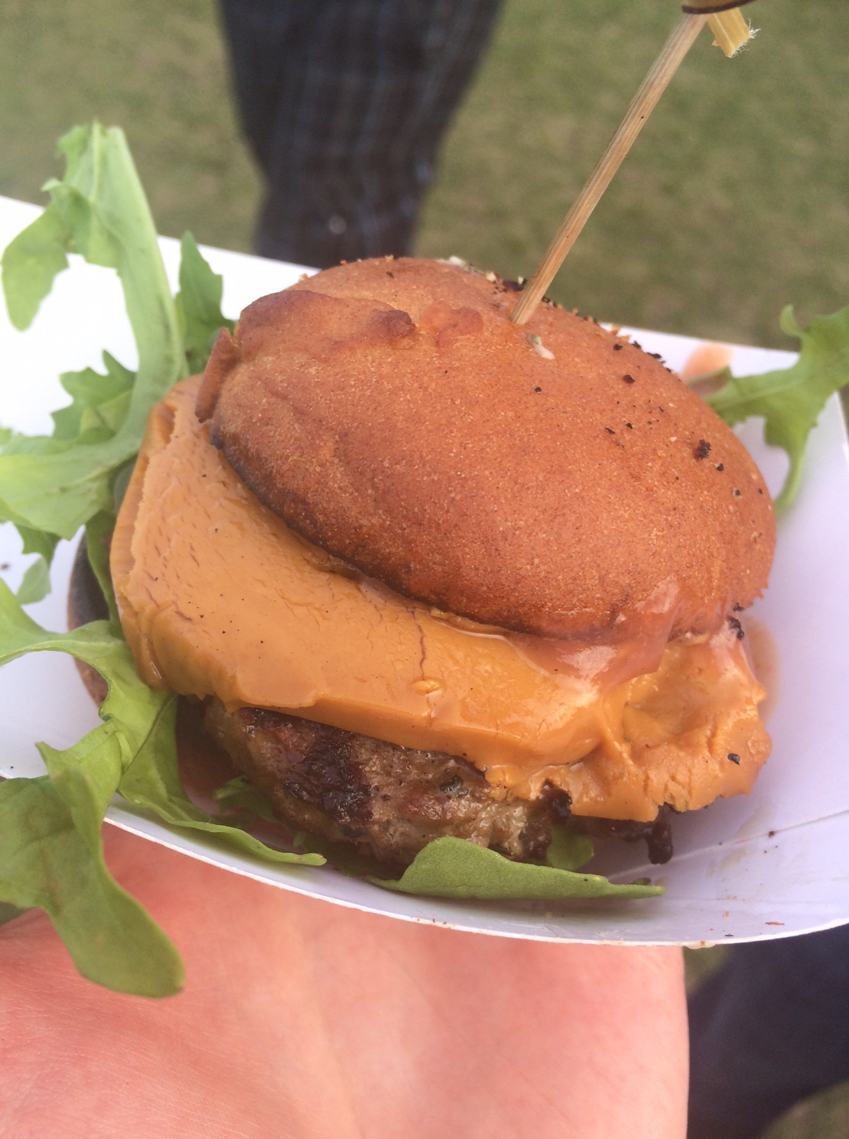 The Golden Nugget took home an award last year, and I had high hopes when I saw this bite featured caramelized onions, rhubarb ketchup, Gjetost cheese (Swedish goat cheese) with charred rosemary aioli, fresh arugula, and a Swedish Limpa bun. Vegetables (some of the only green we saw that wasn’t the grass underfoot) and mysterious Swedish cheese? Count me….out. This was an unpleasant creation. The cheese had the strangest gritty texture and slightly metallic flavor, the rhubarb ketchup had no flavor to speak of, and the pepper arugula didn’t help the balance. This was another one-bite wonder.